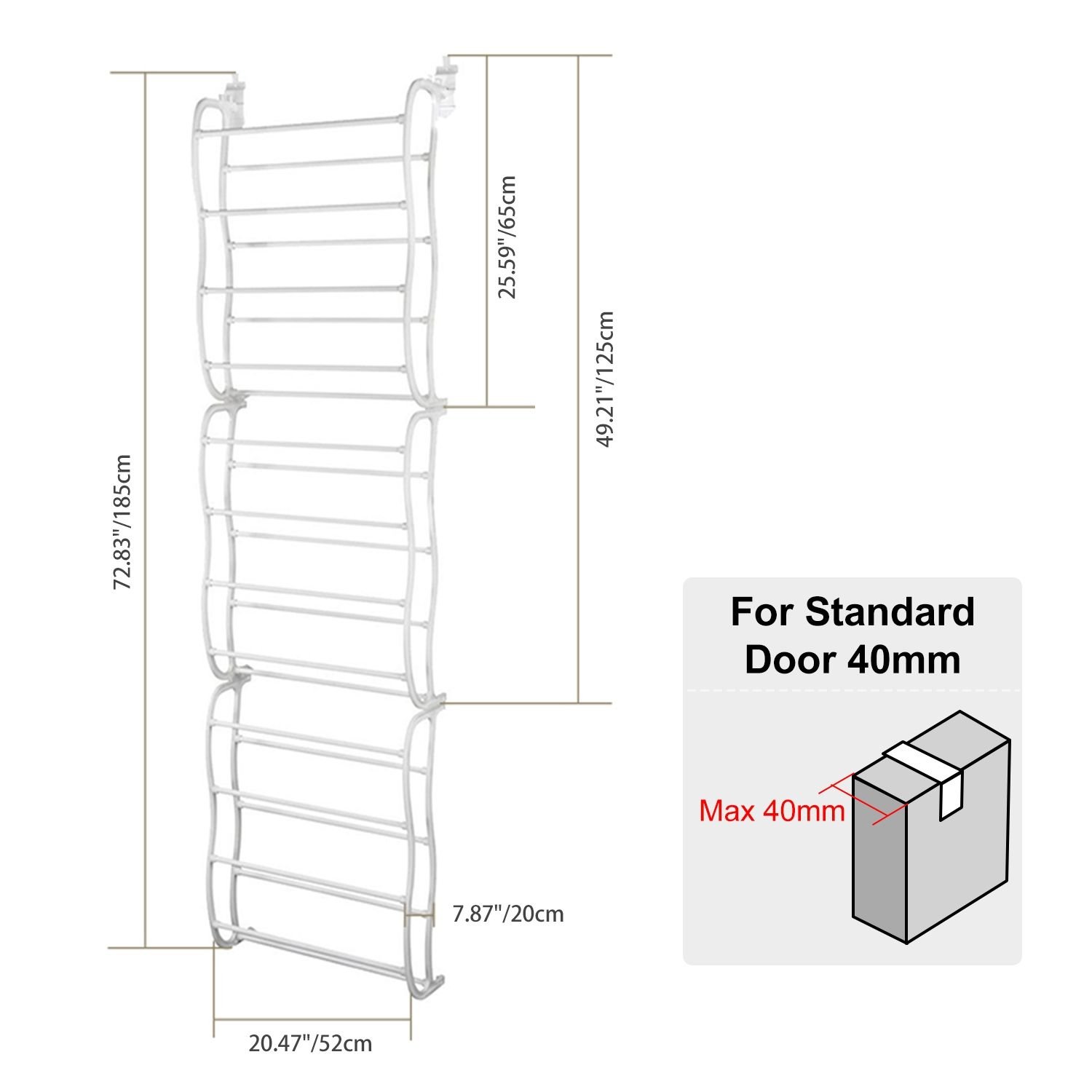 ** EASY TO ASSEMBLE*:Easily assembled into a 12-shelve shoe rack; no tools needed and is perfectly solid once it’s on the door. No worry about shoes falling off; rack coming apart; etc.(Note:Using the coming screws to keep the shoe rack in place is needed to avoid the shoes falling off from the rack.)