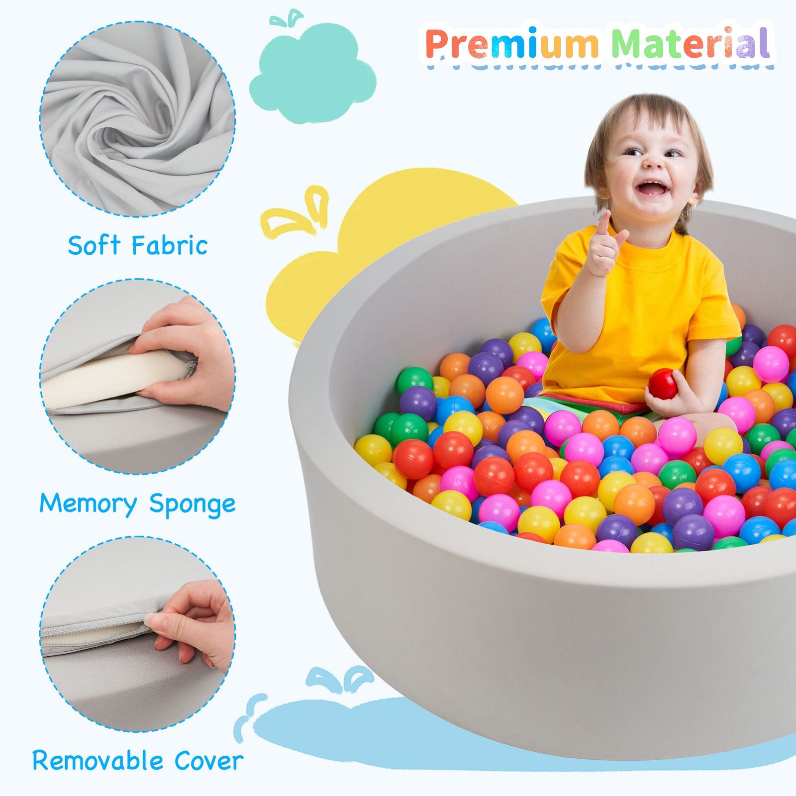 [Product Material & Size] 35.4" x 11.8" x 1.97" (Outer Diameter x Height x Wall Thickness). Ball pits will hold up to 600pcs 5.5cm balls or 400pcs 7cm balls. Ball not included.The ball pit is made of safe and high quality soft memory foam with good buffer function, highly elastic, soft and not easily deformed. The bottom and walls of the ball pits for toddlers are thick enough to protect toddlers from impact.