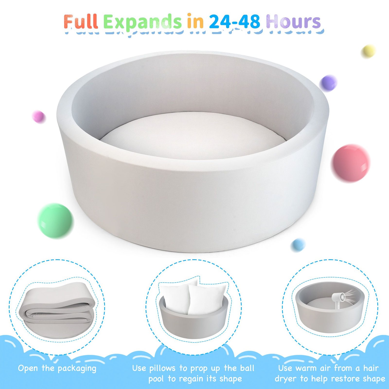 [Easy to Clean] The foam ball pit comes with a removable, washable cover. Which features a zipper design that makes it easy to remove the foam blocks and clean the cover. Simply unzip the cover and remove the foam blocks, then wash the cover in the washing machine. It’s that easy! [Vacuum-sealed Design]The kiddie ball pit is vacuum-sealed. When you open the sponge, it will expand immediately, but it will not show a perfect circle immediately. It can be placed for 2days-3weeks to wait for it to recover. A hairdryer with moderate temperature or stuff the empty ball pit with pillows and blankets will help a lot to shape recovery.