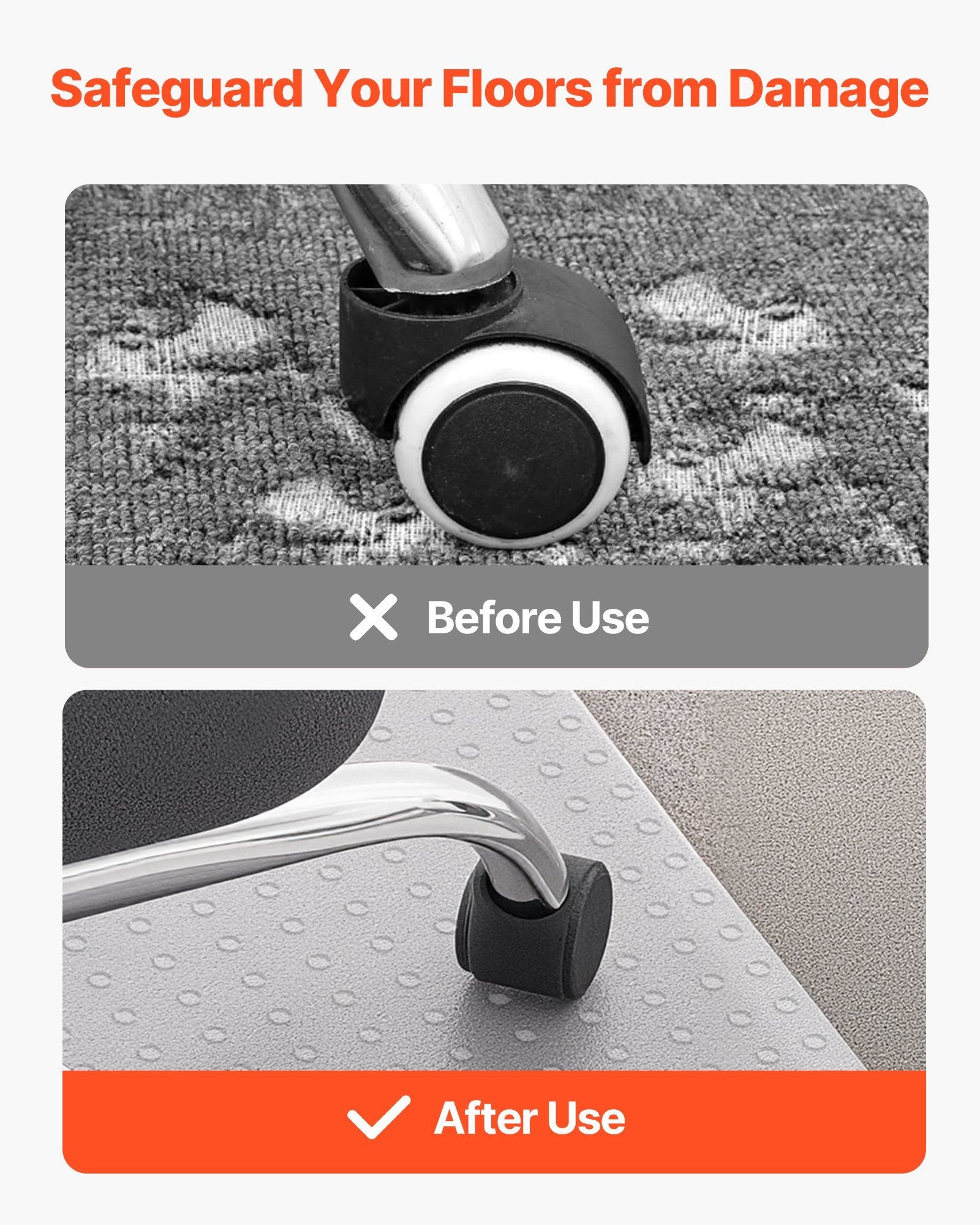 The thick cushioning layer of the clear floor mat absorbs chair wheel pressure, securing your carpet from dents and scratches. It extends carpet life and reduces wear on your chair wheels, keeping everything looking new.