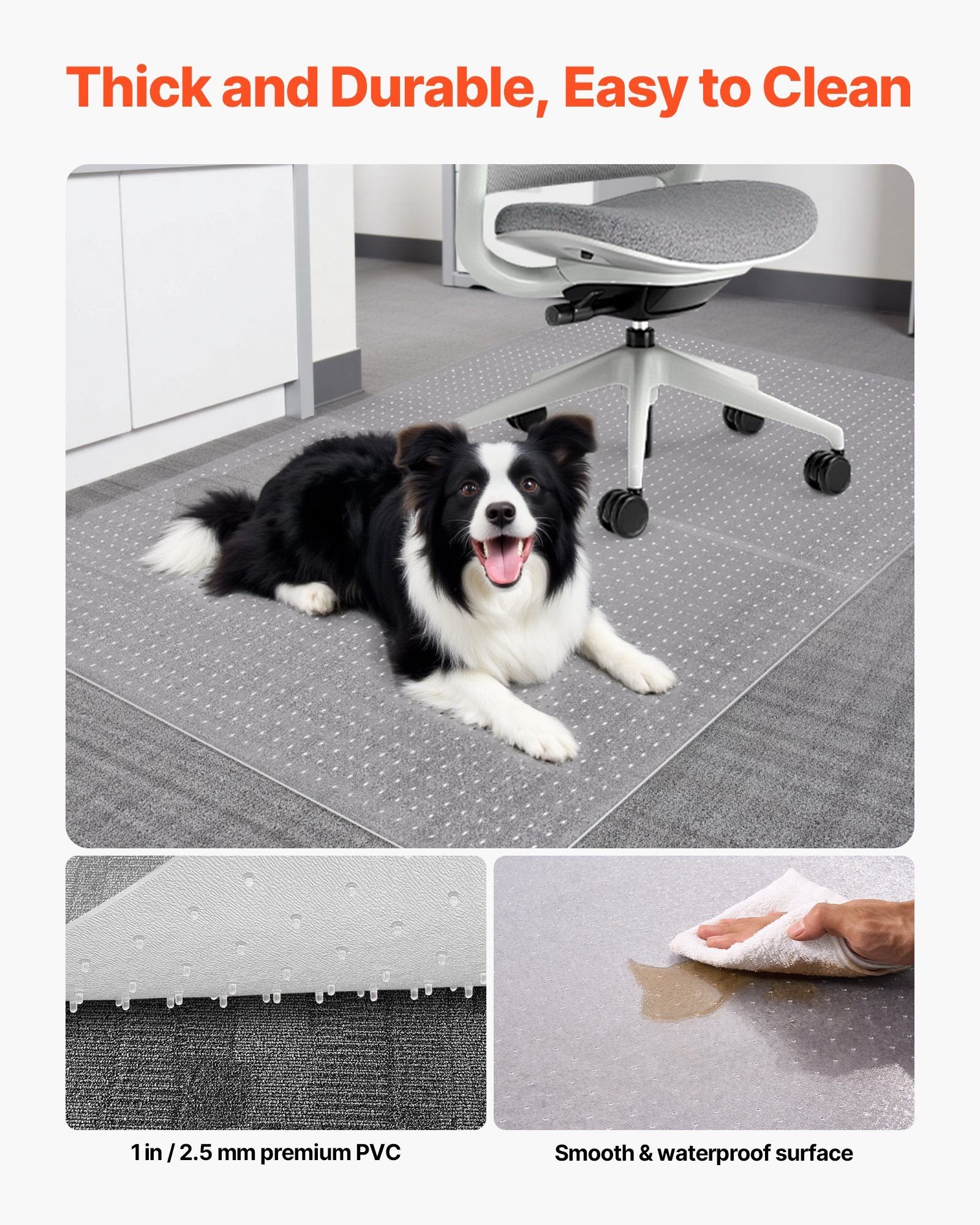 4.Durable & Easy to Clean: Crafted from 0.1-inch / 2.5mm thick PVC, this under desk rug resists cracking and deformation. The smooth, waterproof surface wipes clean easily-say goodbye to stains and dirt in seconds
