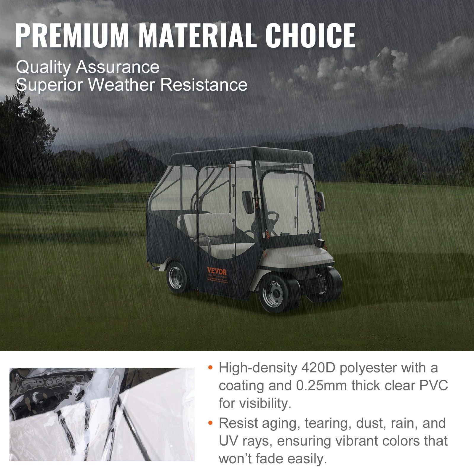 2.Robust Weather Resistance: With a PVC coating made of high-density 420D polyester and a 0.25mm thick transparent PVC section, this golf cart enclosure is built to withstand aging, tearing, dust, rain, and UV rays. Its color retention and durability are enhanced, and the transparent material improves both visibility and endurance.